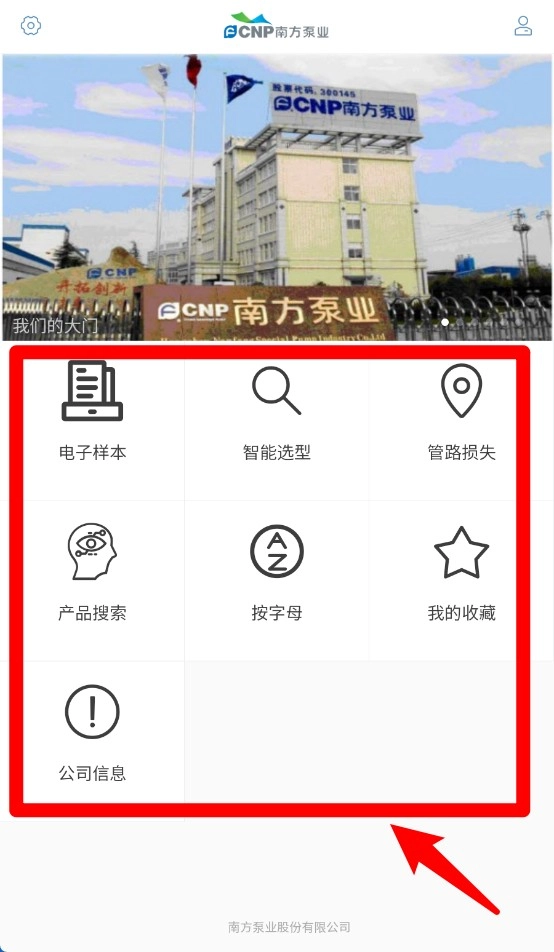 1、首页呈现南方泵业主界面,配备电子样本、智能选型、管路损失等九大快捷功能入口,操作直观便捷。