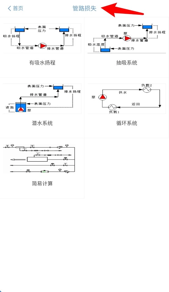 4、管路损失页面配备了多种典型系统图示,可辅助用户计算不同系统场景下的水力损失,从而助力实现精准选型。