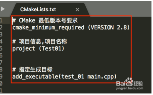 2.新建CMakeLists.txt文件,文件内部声明cmake的最低要求版本,项目名称,以及指定生成的目标