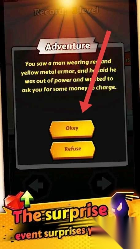 2、遇到奇遇事件(The-surprise-event-surprises-you),选择【Okey】,给身着黄红铠甲的人钱财,从而触发剧情分支。
