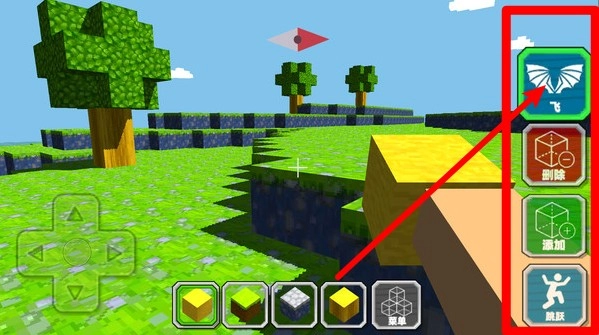 1.点击右侧“飞”按钮可开启飞行模式,在空中自由移动视角与位置,适合快速探索与空中建造高处结构。