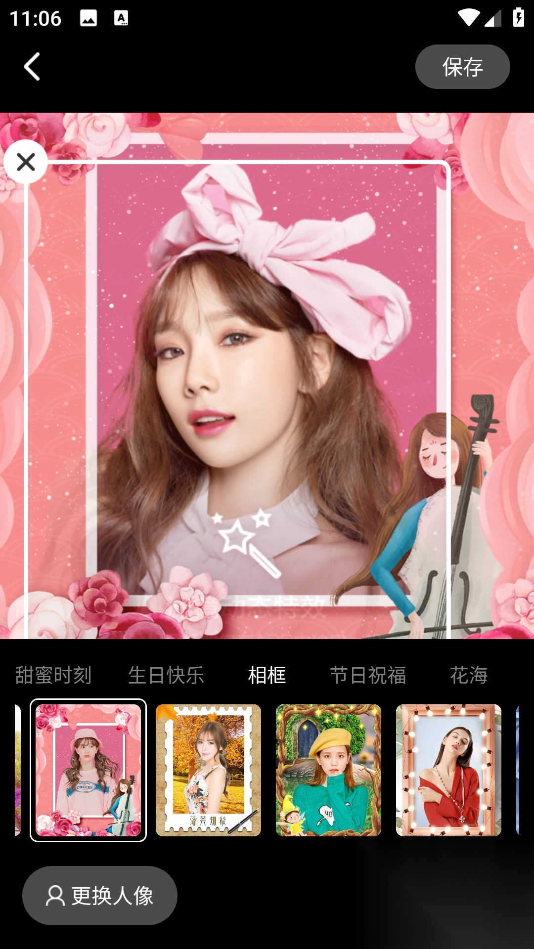 2. 轻点【相框】图标,挑选图片以及自己中意的相框素材,完成预览后进行保存。