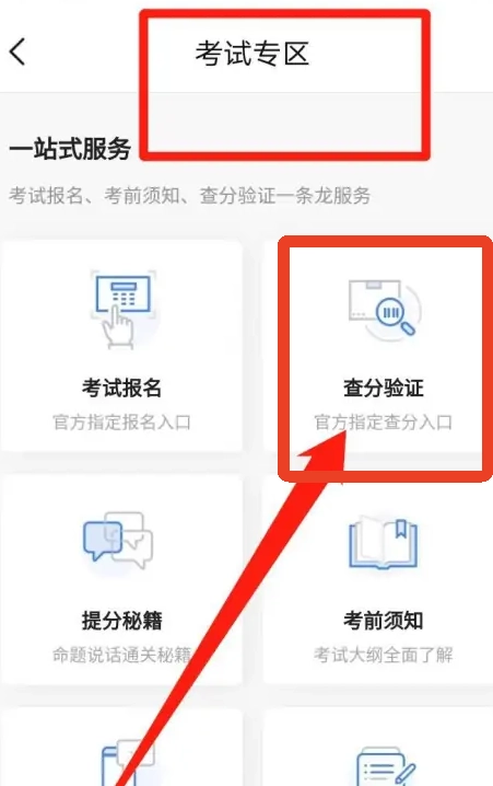 2、当您进入考试专区后,找到并点击“查分验证”选项,随后系统会自动跳转至成绩查询界面。