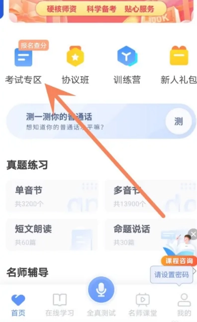 1. 开启畅言普通话,于首页寻觅并点击“考试专区”,从而进入相应功能页面。