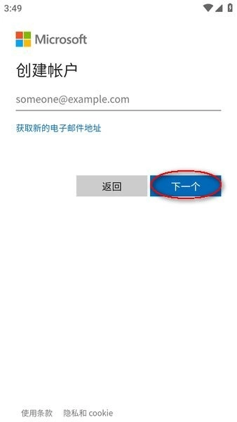 请创建账号,在相应位置输入电子邮件地址,此地址将作为后续登录账号,请务必牢记,完成输入后点击“下一个” 。