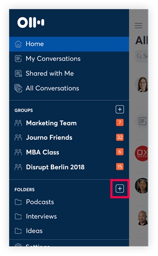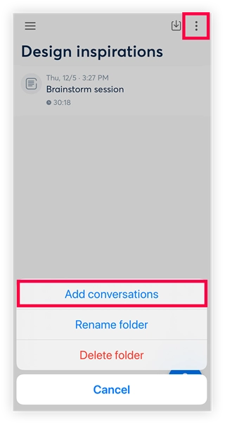 在文件夹界面,点击右上角图标,此时会显示“添加对话”菜单。点击该菜单后,会呈现记录的数据列表,你可从中选择要分类到文件夹里的数据。