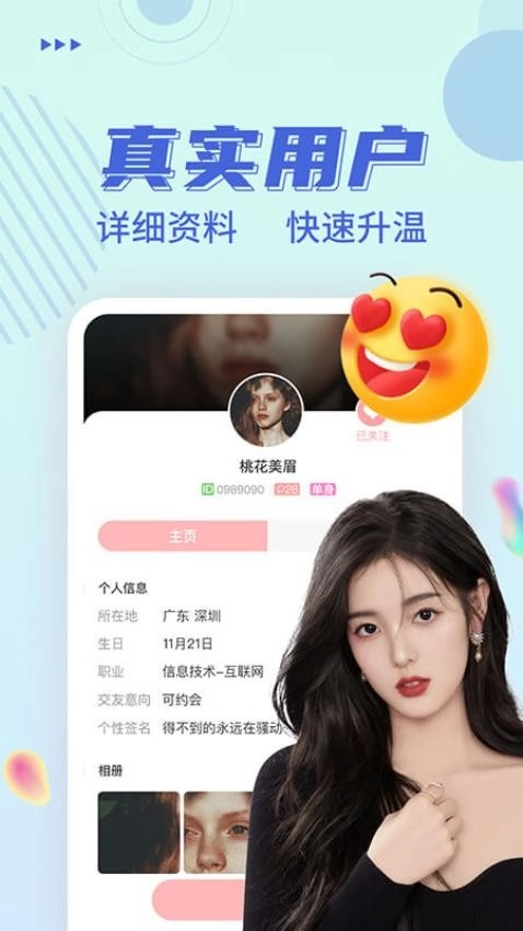 只为助你寻觅到更为投缘的TA!确保你们的邂逅真实可信,让你们的沟通互动更深入、更简单纯粹且真诚。