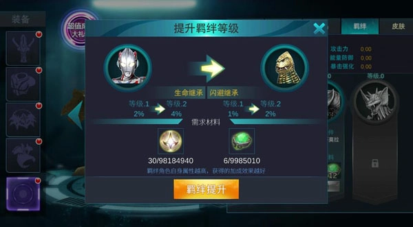 与一般激活羁绊就获得固定属性不同,在《奥特曼传奇英雄》里,羁绊角色自身属性越高,获得的加成效果越好。因此,小伙伴们若想拥有更强属性,就需要培养羁绊英雄,唯有如此,才能获取更强大的属性加成!
