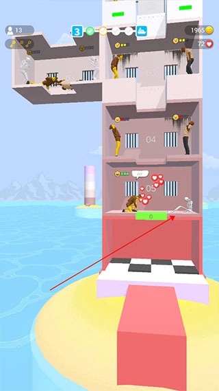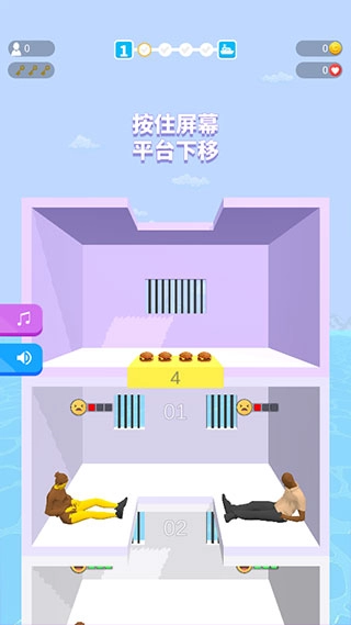 2、长按屏幕,能操控黄色移动平台下降,长按时间越久,下降速度越快;松开屏幕,平台就会停止。每个平台上都关押着一些犯人,他们正等待着被投喂。犯人需求通过颜色区分,红色代表极度需要,黄色代表一般需要,绿色代表不需要。你要把有限的食物和资源,分配给那些最急需的人,帮助他们生存下去。
