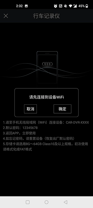 2、开启之前,前往wifi设置界面,选择行车记录仪wifi(其名称在说明书上有标注)。输入密码进行连接(初始密码同样在说明书中标明,进入后可输入密码修改wifi进入密码,操作时请谨慎)。