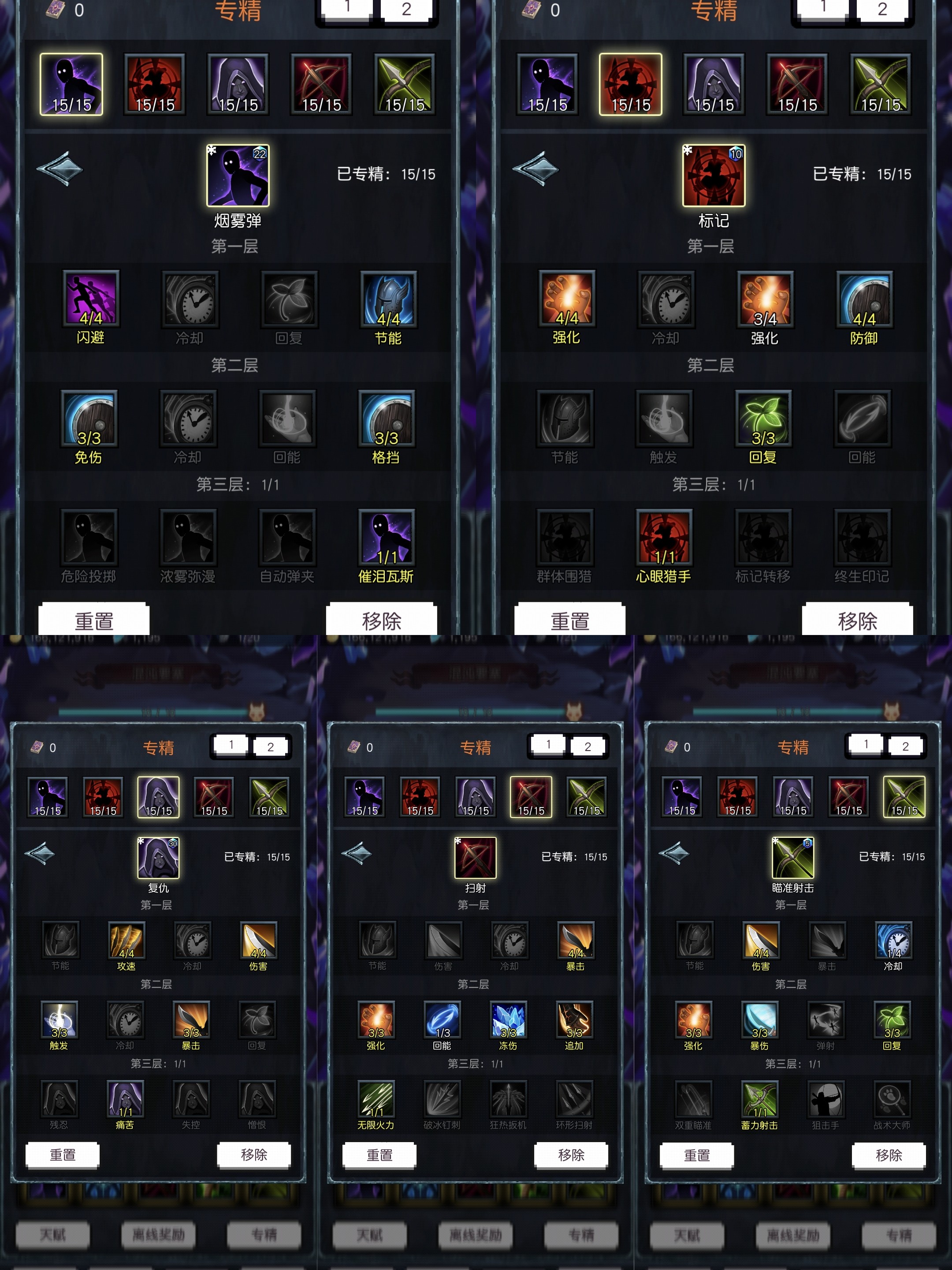 4、技能推荐标记:扫射、飞刃。开局只要瞄准过度就好,前期较为简单,可自行看着搭配那些能无限重置的技能。其他技能看着搭配,能顺利度过前期即可。加点图示仅作参考,具体要依据自身装备来选择。