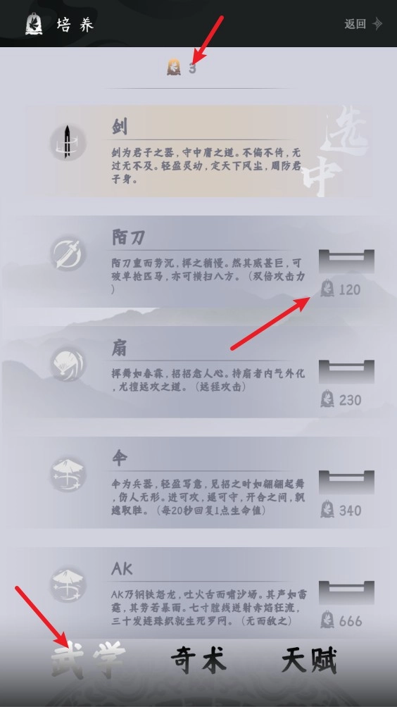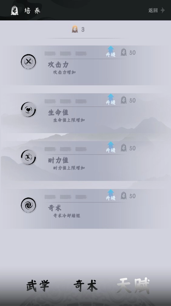 点击“培养”按钮,可使用已获取的金币解锁全新的奇术与武学,同时还能对天赋进行等级提升。