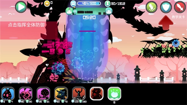 点击右上角的蓝色的按钮来指挥全体防御;