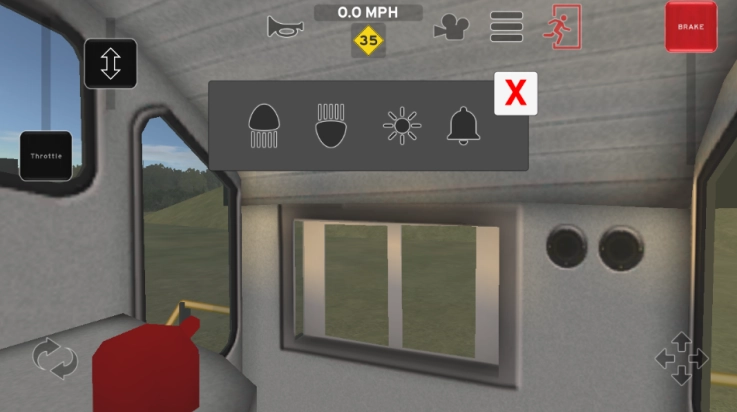 调整右上方的红色操纵杆能让列车启动运行,操作左上方的控制杆可调节列车的行驶速度、实现倒车功能并切换驾驶视角,而那个红色人形图标则是用于下车的按钮。