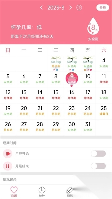 -预估下次月经来潮时间、排卵日期以及受孕概率较高/较低的日期;