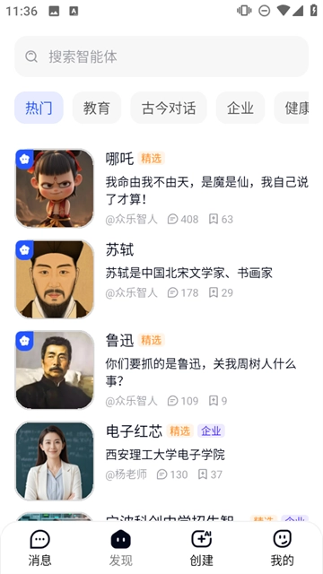 可以在发现页面找到“热门”分类下的“教育”板块,从中选择“古今对话”子分类;也能直接点击像“哪吒”“苏轼”“鲁迅”这类智能体来开启互动。