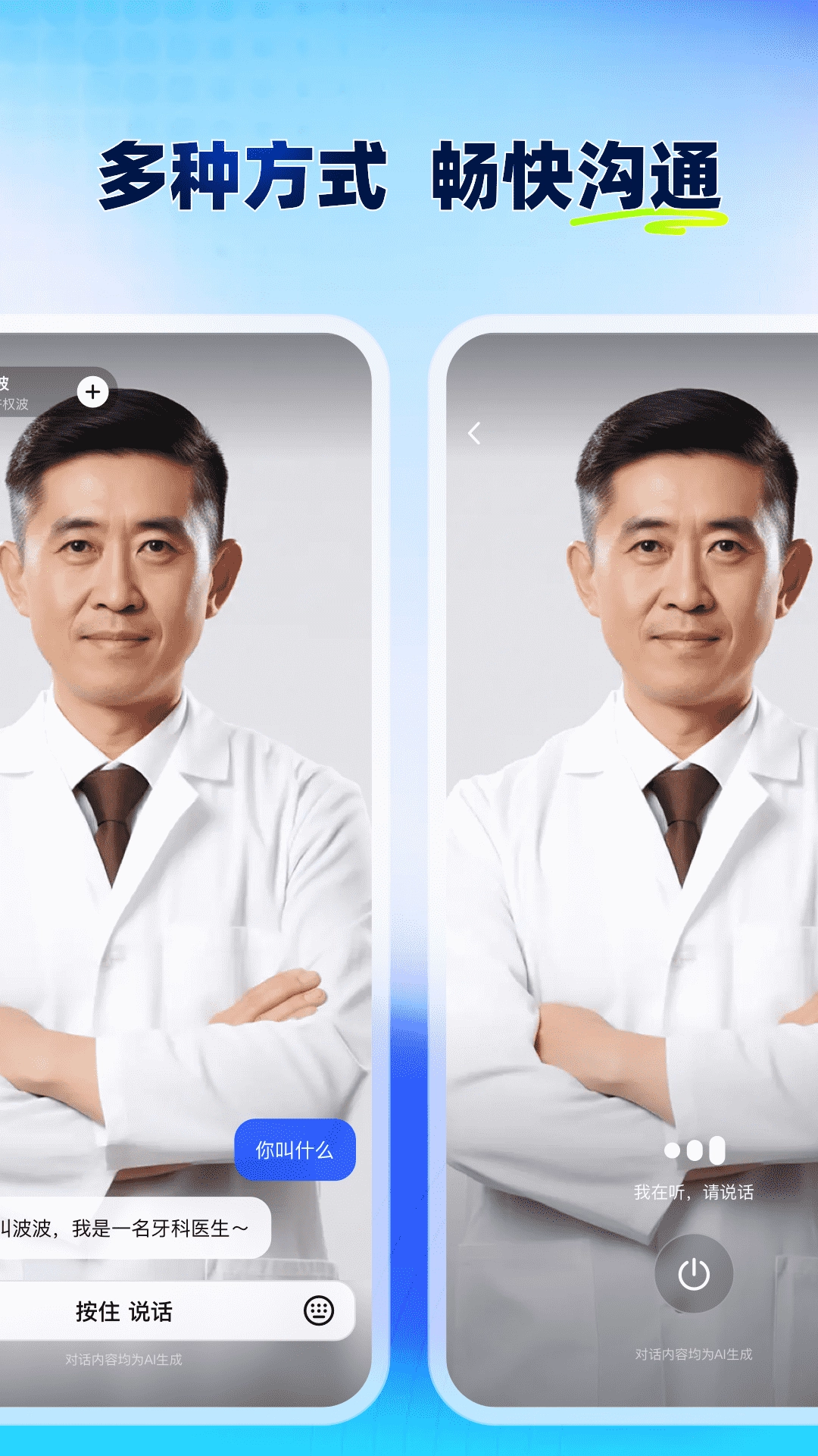 对话界面设置了两种互动方式:一种支持跨地域的即时沟通,让你无论在什么位置都能和智能体畅快交流;另一种则模拟了近距离的互动场景,让对话过程更具沉浸感与真实感。