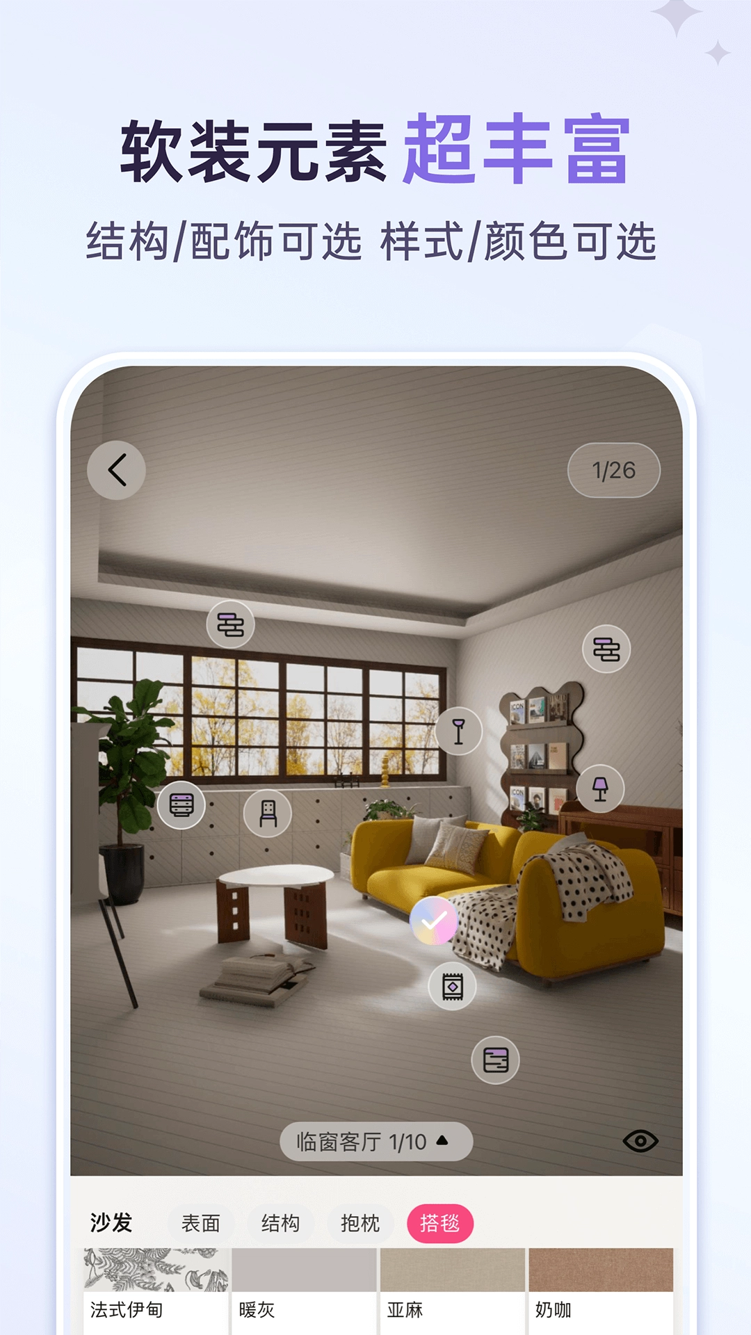 来绘的搭配元素十分丰富,你不仅能挑选不同类型的沙发,还可以针对选中的沙发,在表面、结构等部位的材质上进行多样选择,个性化程度相当高,一千个人或许能搭配出一千种不同的沙发样式,期待大家多多尝试!