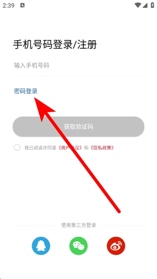 在手机号登录注册页面,点击密码登录选项,即可进入密码登录界面。