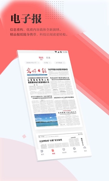 光明日报电子版是一款广为人知的新闻资讯软件,拥有丰富多样的新闻板块和简洁规整的交互界面。用户在软件里能随时浏览各类新闻,借助评论功能表达个人见解并和其他用户互动。要是遇到特别有趣的文章,还能一键转发到社交平台分享给朋友,感兴趣的朋友们别犹豫啦。