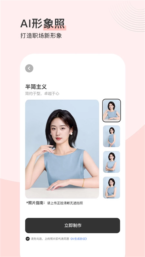 我们准备了10套风格各异、色彩多样的服装供用户挑选,用户能够借助单指拖动调整服装位置、双指缩放改变服装大小,让服装和自身形象精准契合,仅需简单操作几下手指,就能完成从普通形象到职场精英的转变。