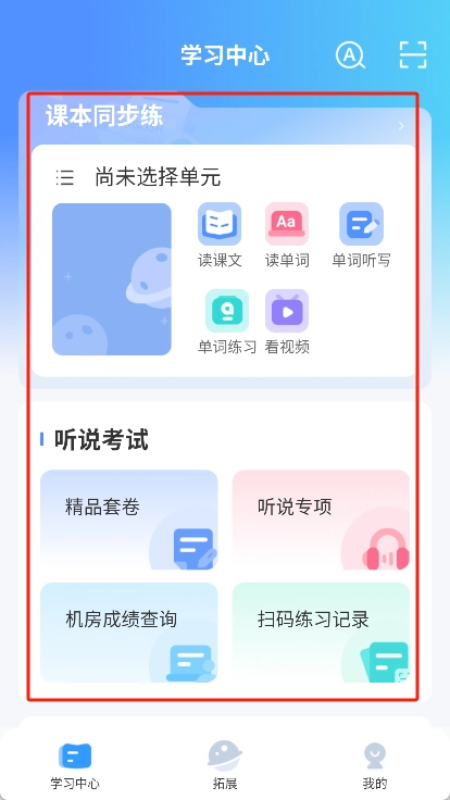 登录后,你可以在首页挑选适合自己的学习板块,像同步教材练习、听说模拟考试之类的都有。