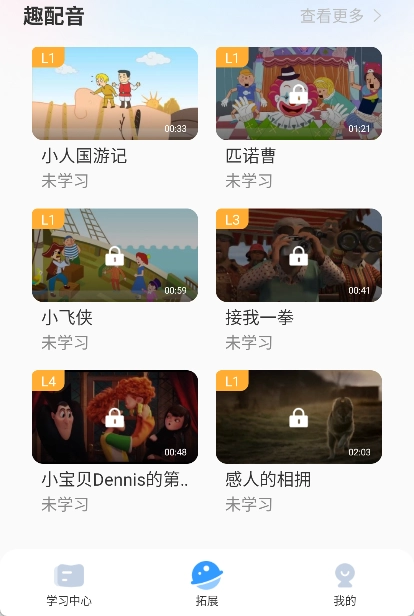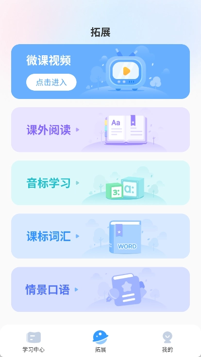 支持微课视频、课标词汇、音标学习、趣配音等多种内容,旨在拓展学生的课外知识,培养综合能力。