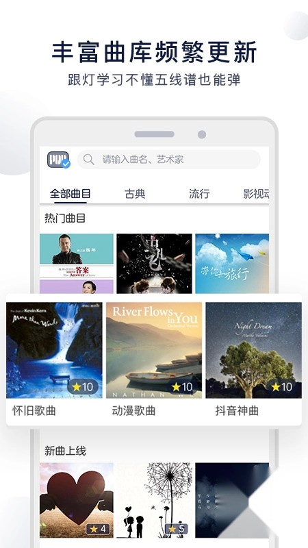 4、海量曲库:平台拥有数量庞大的钢琴曲目资源,覆盖古典、流行、爵士等多种风格类型,用户能够根据自身喜好,随时挑选心仪的曲目开展练习。