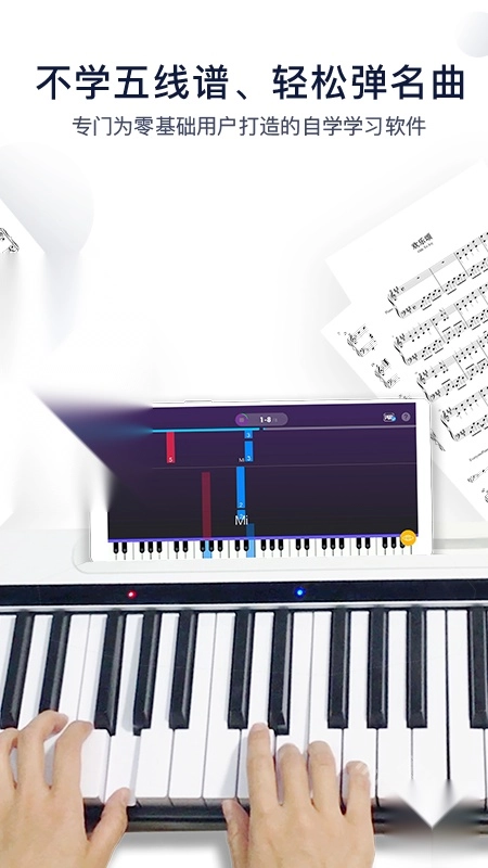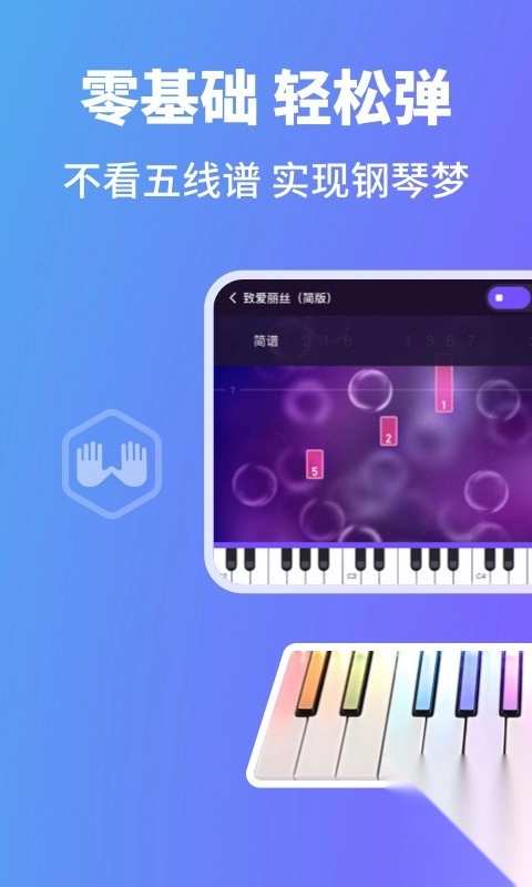 不用费力掌握复杂的五线谱,泡泡钢琴借助直观的引导,会告知你该在何时按下哪一个琴键,以及怎样优雅地运用手指来完成流畅的弹奏。