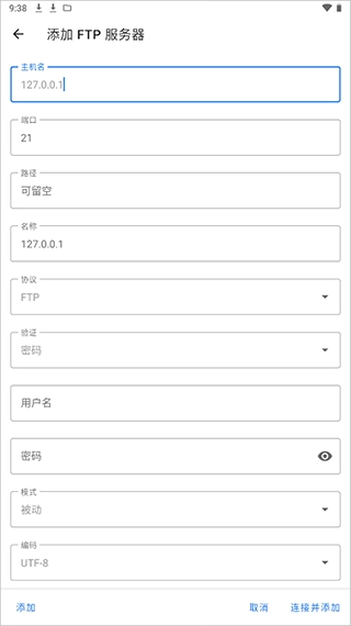 接下来设置主机名为127.0.0.1(这一步很关键,它代表服务器本机,传输时会直接通过本机网络,速度非常快),然后依次配置端口(即刚才设置的端口号)、路径(对应之前设置的根目录的相对路径,该选项可以不填写)、名称(可自行设置,会显示在列表中,若不设置则默认显示为127.0.0.1)、协议(保持默认的FTP即可)、验证方式(默认选择密码验证)、密码、模式(默认使用被动模式)以及编码格式(默认采用UTF-8)。完成所有设置后进行保存,此时列表中就会出现刚才设置的名称。配置全部完成后,启动服务即可使用FTP文件服务功能。