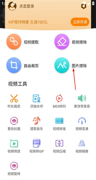 打开软件后,进入首页,看到视频提取等功能,点击图片擦除选项,进入选择图片页面。
