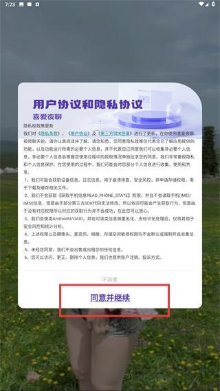 在仔细阅读【用户协议和隐私协议】的内容之后,点击【同意并继续】按钮,就能完成对协议的确认,进而进入到后续的流程中。