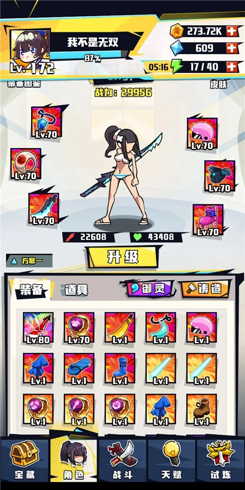 武器方面,每把刀都有其独特之处,升级后的彩装品质都很出色。白刀在刷金币关卡时,一个无双技能就能砍倒五个敌人,懂的玩家自然明白它的厉害。血刀在前期爬塔时,只要不被敌人秒杀,就能凭借持续伤害把怪物慢慢磨死。黑刀的无双技能冷却快、伤害高,还能享受多种属性加成——暴击、爆伤、奥伤都能有效提升它的输出,甚至可以打断BOSS的技能,不过它的前摇较长,对付灵活的怪物时会有些棘手。到了后期装备成型后,黄刀和绿刀也能展现出不俗的实力。而赤影则是目前最难获取的武器。
