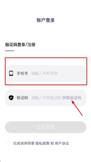 在登录页面输入手机号,勾选相关协议,随后点击获取验证码按钮。