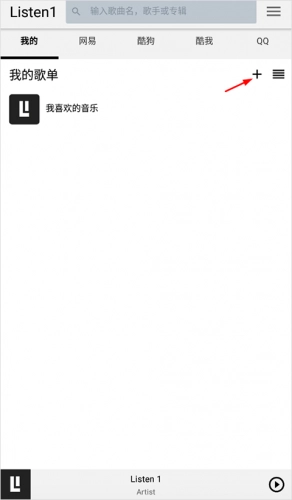 1、首先打开LISTEN1安卓版,在我的一栏中找到歌单旁边这个小加号,点开;