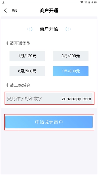 (3)接下来是申请网站二级域名的步骤,按照提示输入你已确定的名称,然后点击“申请成为商户”按钮,之后等待工作人员的审核通知就行。