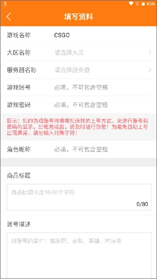 接下来需要填写游戏账号的相关资料,务必确保信息真实,否则会对您在平台上的信誉造成影响。最后按照提示完成对应的操作,就能成功发布了。