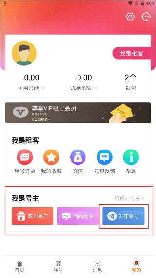1、首先进入优号租最新版首页,切换到【我的】功能模块界面,这里包含租客和号主两种身份,若要发布游戏账号信息,点击右侧的“发布账号”按钮即可。