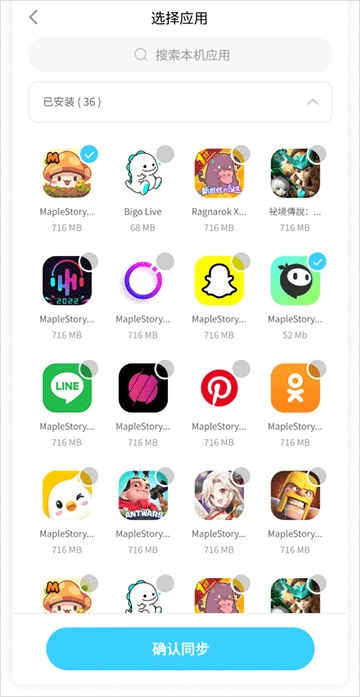 4、进入选择应用的页面后,挑选你想要同步到模拟器的游戏与应用,接着点击“确认同步”按钮就可以了。