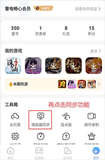 3、接着再次打开雷电圈,在“我的”界面里点击“模拟器同步”按钮