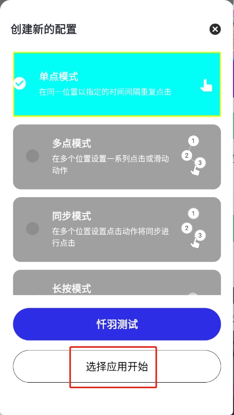 3、选择点击模式以后点击选择应用开始。
