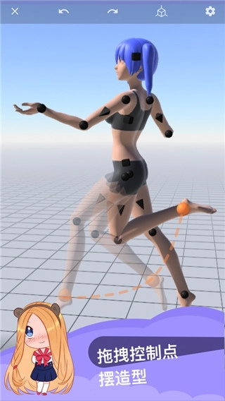 4、拖动人偶身上的控制点来摆放造型。我们的物理引擎能让您如同操作真实素体人偶一般操控3D人偶模型,还会自动将其调整成您期望的动态姿势。