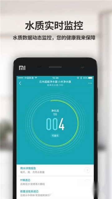 智能数据查询 借助手机应用程序,可查看云米超能净水器、云米智能冰箱等设备的大数据信息,实时监测家中自来水水质、冰箱内食物状态、用户用水量、水温以及滤芯寿命等动态数据。
