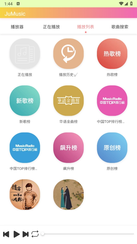 2、进入首页后,点击“播放列表”,这里汇聚了丰富的音乐资源,涵盖热歌榜、新歌榜和飙升榜等各类榜单。