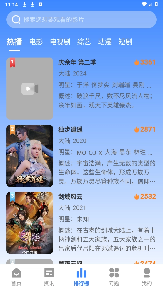 皮蛋影视,汇聚精彩的影视剧集,在手机端就能畅享高品质的追剧体验。平台集成了电视剧、电影与综艺等丰富内容,每一部影片均为当下最新最热的佳作,提供高清且免费的观看资源,更新速度十分快捷。此外,还支持发送弹幕功能,让你在追剧的同时能与其他观众互动交流。剧集更新及时,助你轻松告别剧荒困扰。