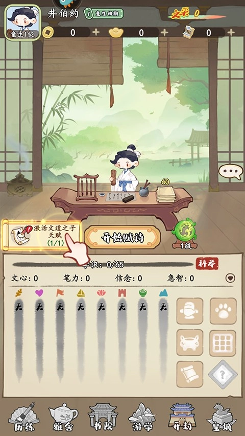 4、开启赋诗环节,借助作诗来提升文采、气运、才情等属性,进而对人物的成长及交互事件产生影响。