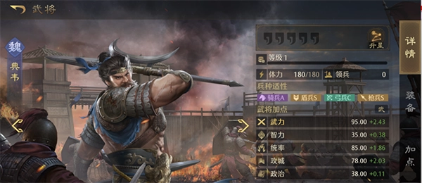 游戏中不同的武将会具备针对各类兵种的适应性数值,这一数值在武将体力条的下方以BAS标识呈现。兵种适应度的高低直接影响着武将属性值的强弱,适应度越高,武将的属性值就越出色——具体来说,S级对应120%的属性值,A级为100%,B级则是80%。
