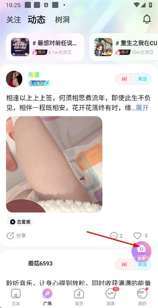 2、在广场动态页面点击底部的发布按钮,进入内容编辑页面。