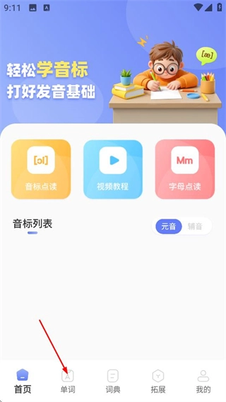 1、在英语标准国际音标的首页,点击页面底部的单词选项,即可进入单词页面。