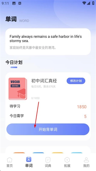 2、进入单词页面后,点击“开始背单词”按钮,即可进入背单词页面。